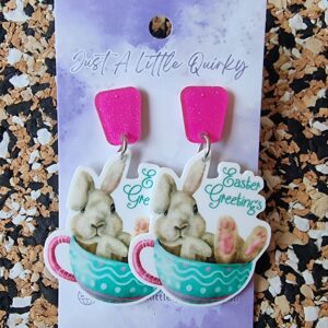 Easter Greetings Bunny In Teacup Acrylic Stud Dangle Earrings