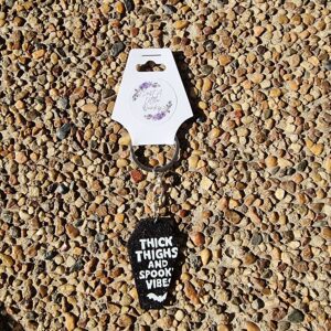 Looking for a super cute gift or maybe even just a new addition for your own keys then look no further than our thick thighs spooky vibes keyrings. A nice light-weight addition to add to any set of keys or even to add as a bag tag.